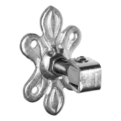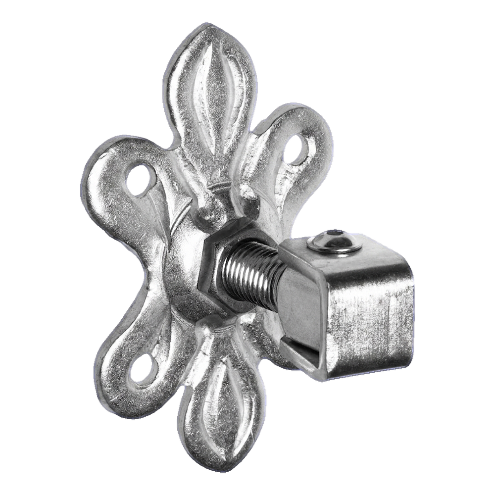 Koristekilpi heraldisen liljan muodossa antaa saranalle esteettisen, koristeellisen luonteen — ihanteellinen portteihin ja porteille, joissa kestävyyden lisäksi myös rautatöiden ulkonäkö on tärkeää. Neljä asennusreikää kilvessä varmistavat vakaan ja tasaisen kuormituksen jakautumisen pylvään tai siiven pinnalle.