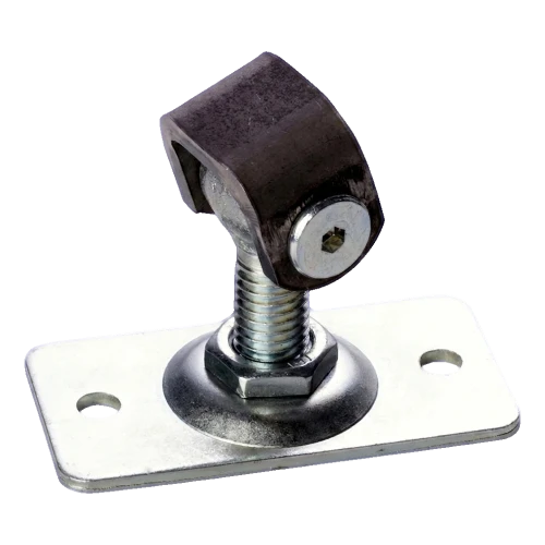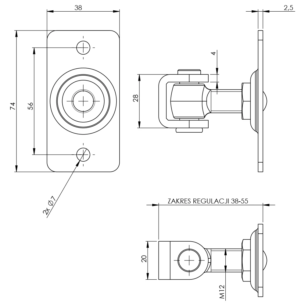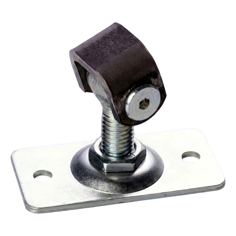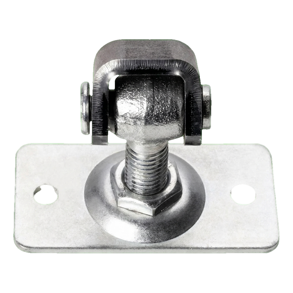 Suorakaiteen kilpike neljällä asennusreiällä varmistaa vakaan ja varman kiinnityksen pylvääseen tai kehykseen. M12-kierteinen ruuvi mahdollistaa sujuvan säädön ulokeman alueella 38–55 mm, mikä antaa asentajalle täyden hallinnan portin asetteluun pylvääseen nähden. Saranan silmukka pyörii vapaasti tappiakselilla, varmistaen lehden sujuvan toiminnan.