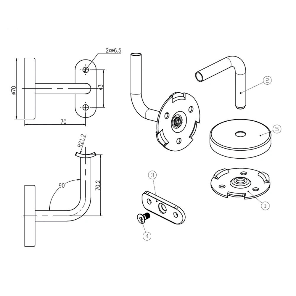 Maskirengas halkaisijaltaan 70 mm peittää tehokkaasti seinän kiinnitysreiät tarjoten esteettisen lopputuloksen. Kolme kiinnitysreikää seinälevyssä takaavat vakaan ja varman kiinnityksen, mikä vaikuttaa positiivisesti koko kaiderakenteen turvallisuuteen.