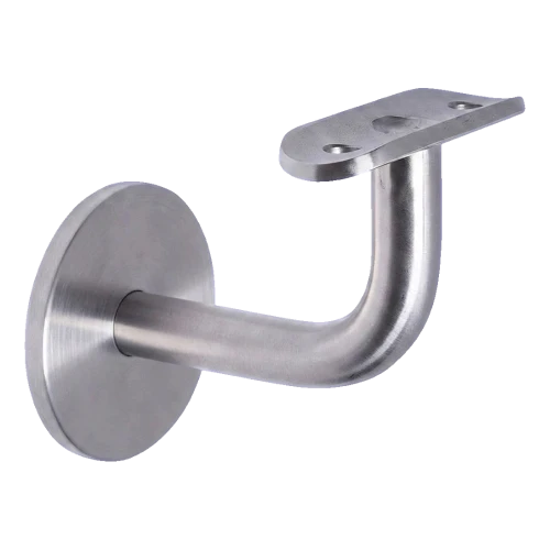 Kiinnike koostuu seinään kiinnitettävästä pyöreästä rosetista, taivutetusta kantavasta varresta sekä kiinnityslevystä (satulasta), joka mahdollistaa kaideputken ruuvaamisen kiinni. Kiinnityslevy yhdellä kiinnitysreiällä sisältyy sarjaan. Seinään kiinnitettävät ruuvit eivät sisälly pakkaukseen — valitse ne alustan mukaan (betoni, tiili, kipsikartonkilevy).
