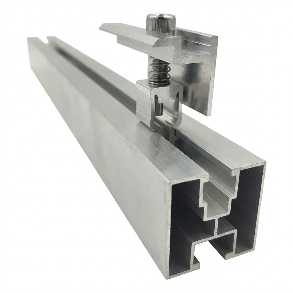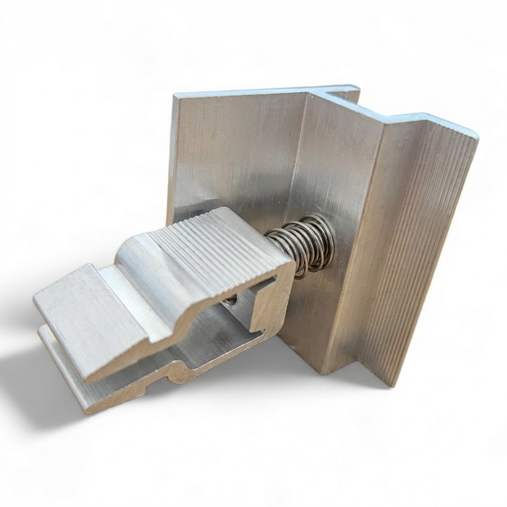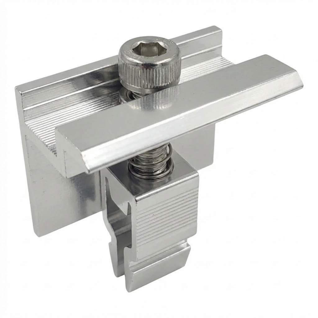 Kiinnike on valmistettu 6060-alumiinista hopeaanodointiviimeistelyllä, mikä takaa korkean korroosionkestävyyden ja klassisen, neutraalin ulkonäön, joka sopii useimpiin aurinkosähköasennuksiin. Hopeinen viimeistely sopii erinomaisesti yhteen alumiinisten asennusprofiilien kanssa luoden yhtenäisen estetiikan koko järjestelmälle.