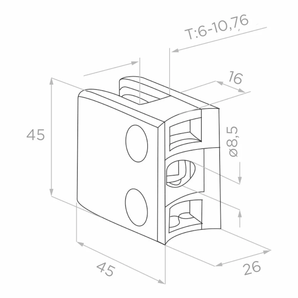 Suorakulmainen lasipidin 45×45×26 mm ruostumattomasta teräksestä AISI 304 kiillotetulla (peili) viimeistelyllä. Tuote on suunniteltu 6–10,76 mm paksuisten lasilevyjen kiinnittämiseen O42,4 mm halkaisijaltaan oleville putkipilareille. Tukeva rakenne ja esteettinen viimeistely tekevät pidikkeestä erinomaisen valinnan lasikaiteiden, väliseinien sekä sisä- ja ulkotilojen lasirakenteisiin.