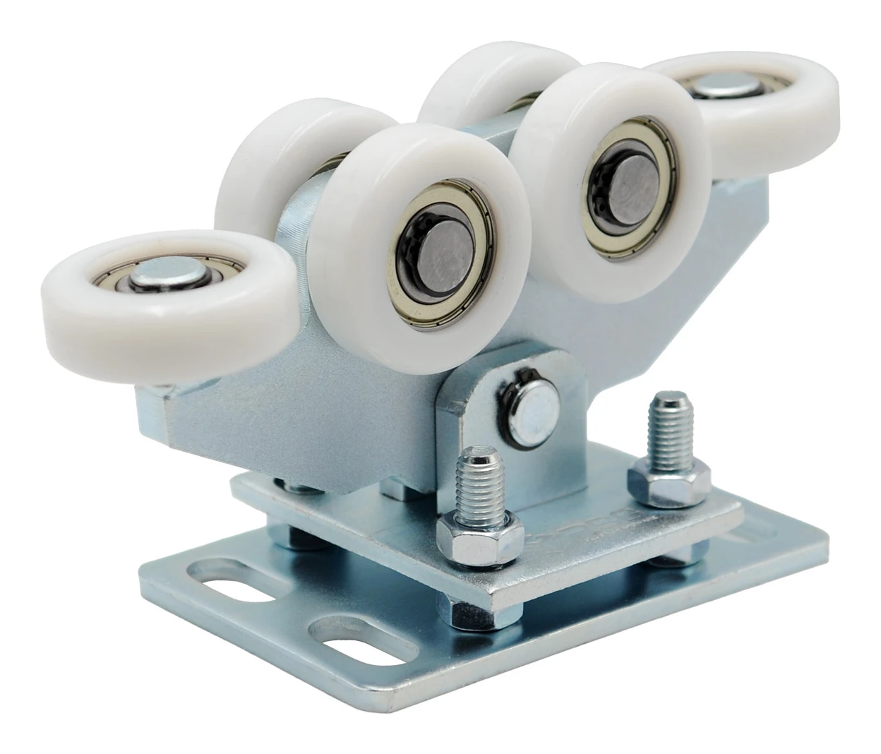 Paketin ydin on pari 6-rullaista liukuvaunua laakereiden varaan asennetuilla nylonrullilla. Neljä kantavaa rullaa ja kaksi vaakasuoraa rullaa takaavat erinomaisen vakauden sekä tarkan portin ohjauksen kiskossa. Vaunun keinuva rakenne — joka perustuu vaunun ja alustan yhdistävään tappiineen — mahdollistaa automaattisen mukautumisen portin liikerataan. Tämä minimoi jännitykset, parantaa toiminnan sujuvuutta ja pidentää merkittävästi koko mekanismin käyttöikää. Korkeussäätö ruuvien avulla mahdollistaa tarkan porttiin sovittamisen asennuksen aikana.